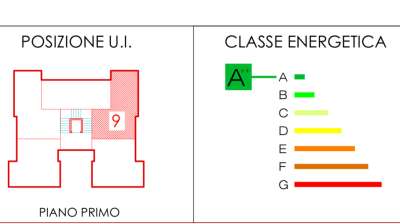 L´appartamento ´´9´´ è sito al primo piano ed è così composto: ingresso, soggiorno con angolo cottura con accesso a pergolato, camera matrimoniale, cameretta, bagno dotato di finestra. Al piano superiore troviamo un´ulteriore camera, un bagno e un soppalco con affaccio sulla zona giorno. Completa la proprietà un posto auto. Classe energetica A++ grazie all´impianto fotovoltaico, pannelli solari, impianto di riscaldamento a pavimento, coibentazioni. Consegna giugno 2026, possibilità di ampie personalizzazioni e scelta del capitolato.