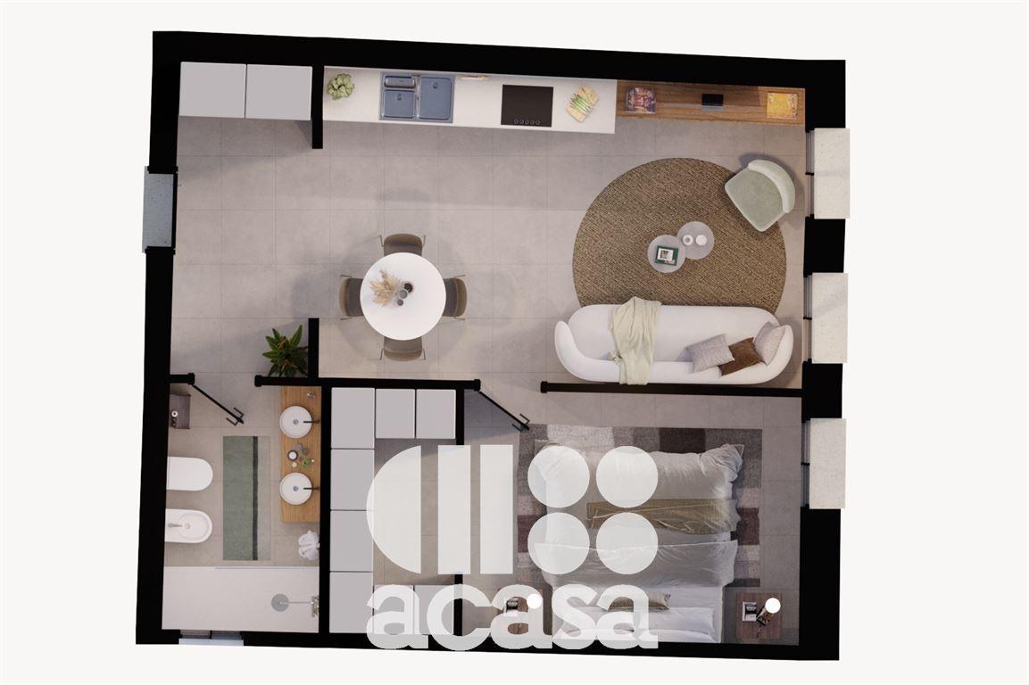 Appartamento al piano secondo servito da ascensore. Ingresso, soggiorno con angolo cottura, disimpegno, camera da letto con cabina armadio e bagno.
