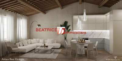 HISTORICAL CENTRE - Characteristic attic on the third and last floor of a small renovated building whose staircase is easy and the large loggia allows parking bicycles. The apartment is completely restored with high quality materials and finishes and also keeping attention to preserve the typical rustic style of Lucca, among its comforts it is equipped with floor heating and air conditioning predisposition. It consists of an entrance-hallway, a large living room with open plan kitchen of sqm. 40 net, two double bedrooms, two bathrooms, a storage area; through a wooden staircase, you access to a very light altana with a beautiful view on the monuments and hills of the town, to be used as a second living room or a third bedroom. Energy class D, Ep 80 kWh/mq. year. Asking price negotiable.