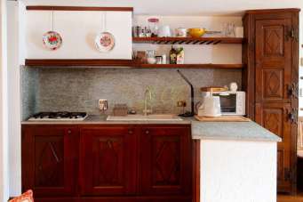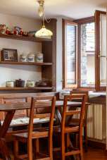 L´appartamento, posto al 1°, in TIPICA CASA IN PIETRA, è così composto: ingresso su disimpegno, soggiorno con zona pranzo, camino e accesso al balcone con vista sulla piazza; angolo cottura a vista (dotato di frigo piccolo con ghiacciaia, piano cottura 4 fuochi gas, forno microonde).