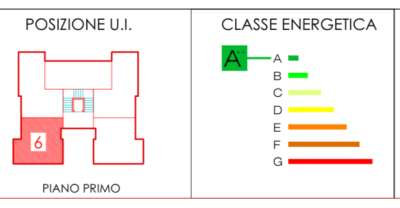 L´appartamento ´´6´´ è sito al primo piano ed è così composto: ingresso, soggiorno con angolo cottura con accesso a pergolato, disimpegno, camera matrimoniale, cameretta, bagno dotato di finestra. Al piano superiore troviamo un soppalco con affaccio sulla zona giorno. Completa la proprietà un posto auto. Classe energetica A++ grazie all´impianto fotovoltaico, pannelli solari, impianto di riscaldamento a pavimento, coibentazioni. Consegna giugno 2026, possibilità di ampie personalizzazioni e scelta del capitolato.