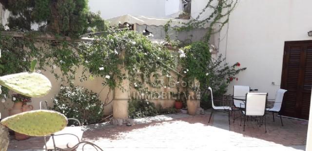 La casa è nel centro storico ed è di interesse storico per la presenza di un baglio interno in cui domina un pino secolare. Dista circa 200 mt dal mare. È distribuita su due livelli, più una mansarda. Si può dividere in due appartamenti ben distinti. Al piano terra vi sono tre camere più i servizi ( cucina e bagno) e un ampio cortile interno. Al primo piano vi sono tre camere da letto, due bagni e una veranda, da cui si accede alla veranda della mansarda. La casa occupa una superficie edificata di 90 mq sia a piano terra che al primo puano, più 100 mq di cortile, a cui si aggiungono la mansarda con veranda. Le rifiniture interne sono di pregio e data la disposizione delle camere e dei bagni potrebbe essere adibita a B and B\n\nLa superficie totale esclusa la mansarda con veranda, è di 280 mq