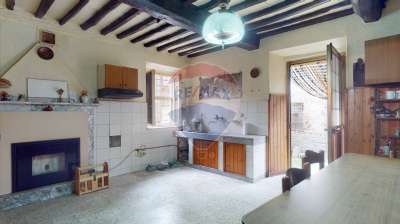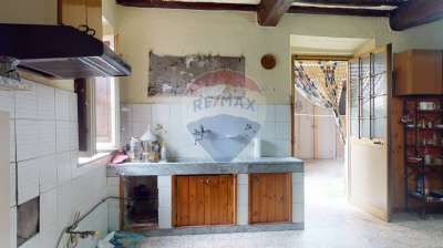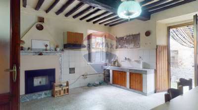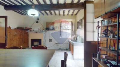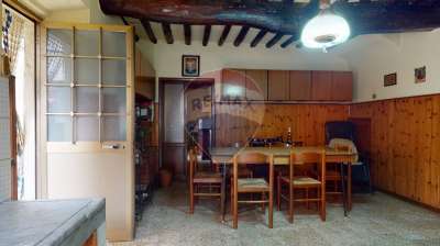 PIANO TERRA: Ingresso, vano scale, soggiorno, ripostiglio, cucina zona pranzo con camino a pellett (e uscita su corte esterna privata con forno a legna, bagno di servizio, 50 mq di giardino), stanza di passaggio, cantina di circa 43 mq. con accesso sia interno che esterno, altra cantina di circa 30 mq.