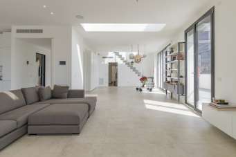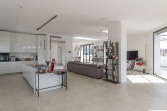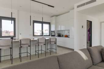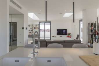 L´interno dell´appartamento è un perfetto connubio di eleganza e funzionalità. Al piano inferiore, un ampio e luminoso salone accoglie gli ospiti, grazie alle magnifiche vetrate che si aprono sul terrazzo, permettendo di godere di una vista impareggiabile. La cucina a vista, di design moderno e raffinato, è perfetta per chi ama cucinare in un ambiente elegante ma pratico.