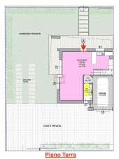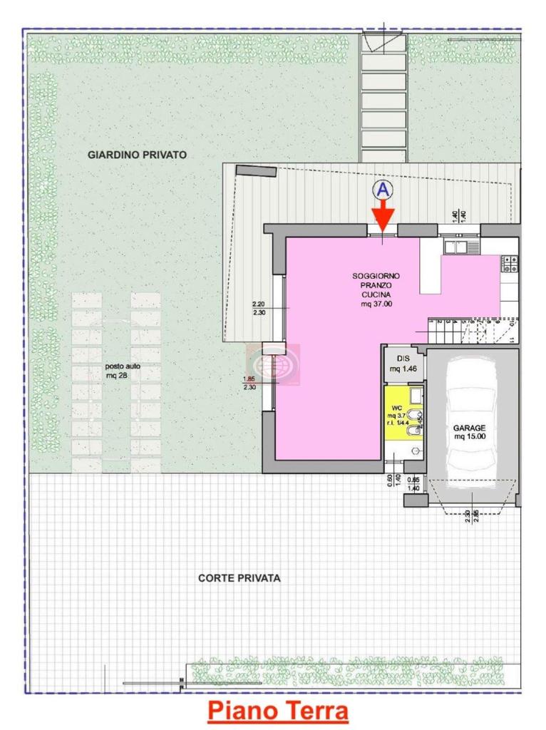 PIANO TERRA - ingresso su zona giorno open-space di 37 mq con zona cottura a vista con affaccio sul giardino privato di oltre 200 mq con area per posti auto, bagno e garage;